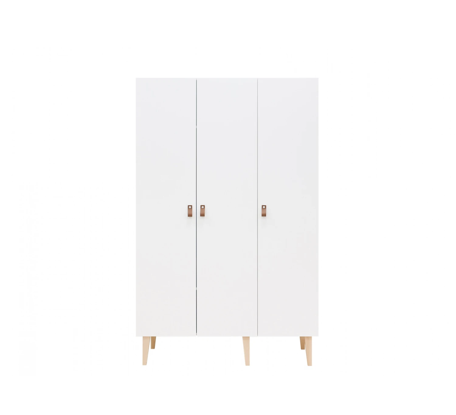 De 3-deurskast van de serie Indy is voorzien van lederen handgrepen. De ranke pootjes zijn utigevoerd in beukenhout. Afgewerkt met een lak op waterbasis, dat milieu- en kindvriendelijk is. Achter de linkse en middelste deuren bevinden zich twee legplanken en een hangroede. Achter de rechter deur geven de vier legplanken veel opbergmogelijkheden.