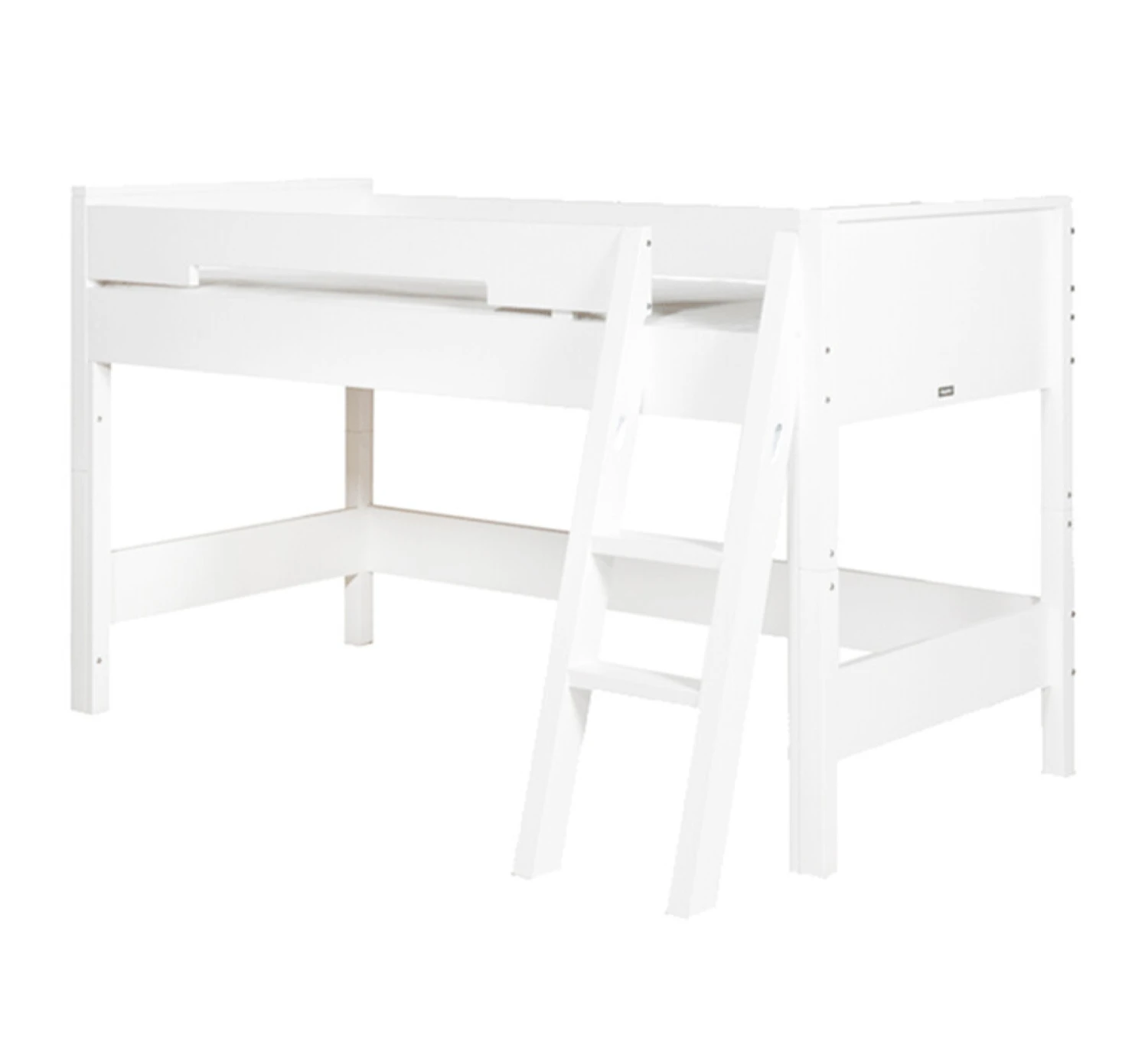 Half hoogslaper met schuine trap, de trap kan zowel links als rechts gemonteerd worden. De trap heeft ovale uitsparingen voor extra grip tijdens het in- en uitstappen van het bed. Inclusief houten lattenbodem. Dit product wordt geleverd met witte plastic afdekdopjes voor de zichtbare schroeven. Onder het bed is nog ruimte voor een kastje of een bureau. Het programma Combiflex van Bopita bestaat uit diverse bedden die ombouwbaar zijn. De basis van ieder bed is het basisbed. Dit bed is om te bouwen tot vrijwel ieder model tienerbed. Optioneel is een speelhuisje onder deze halfhoogslaper te hangen. In een handomdraai tover je de ruimte onder het bed om tot speelplek! De maximale matrashoogte bedraagt 17 cm.