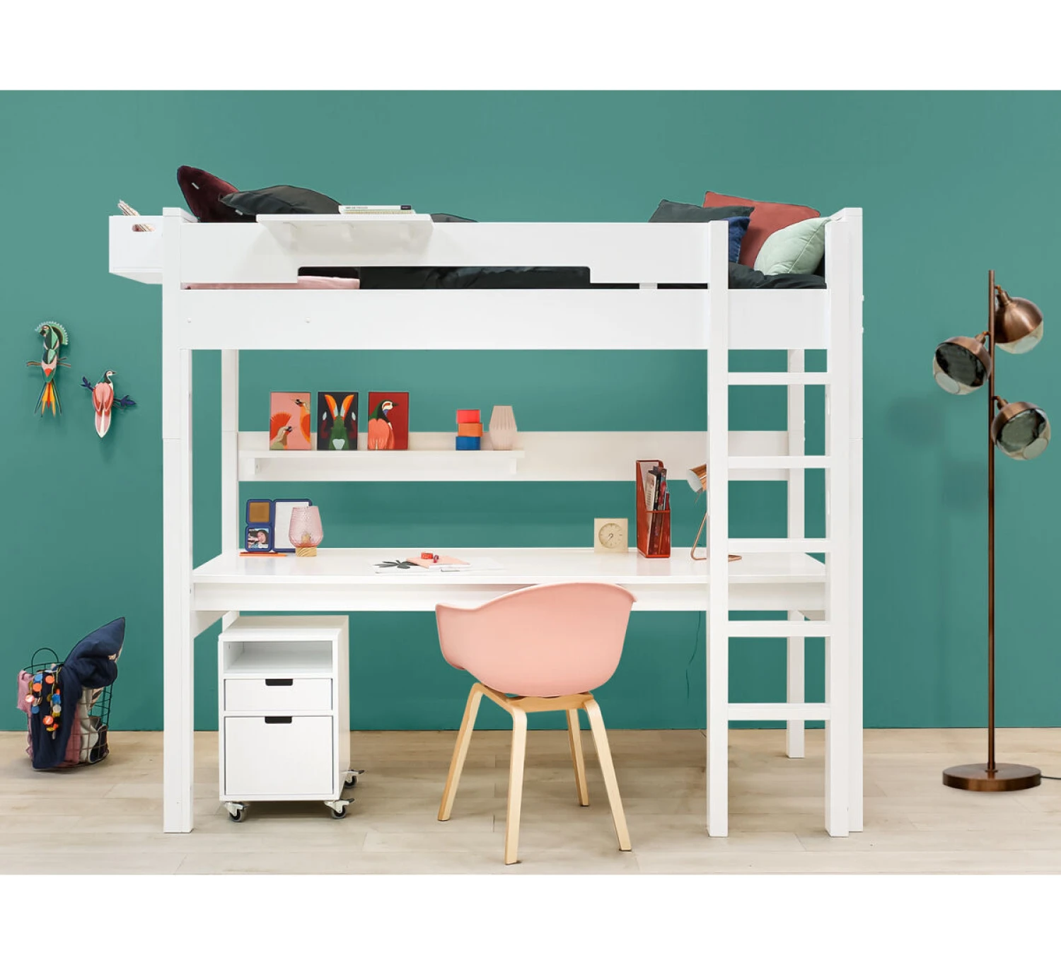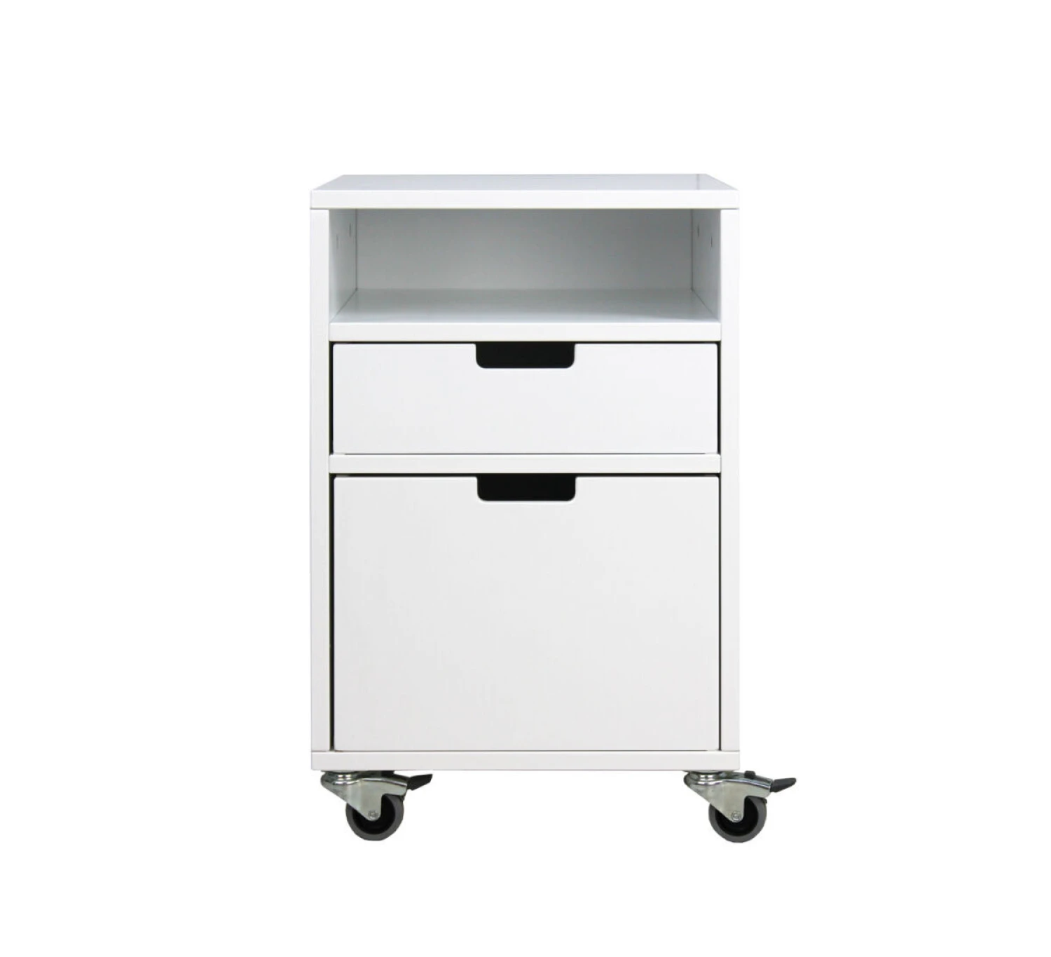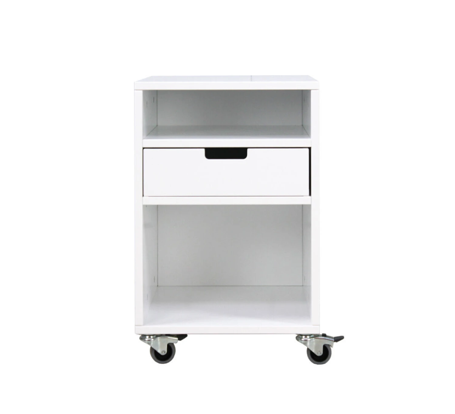 Ladenblok op wielen uit de serie Mix & Match in wit. Dit kastje heeft 1 open vak, 1 vaste lade en 1 open ruimte voor een Mix & Match bak (optioneel). Het kastje is verrijdbaar en zowel als nachtkastje te gebruiken als onder een bureau.