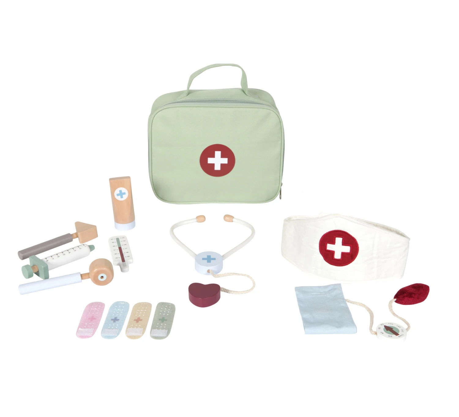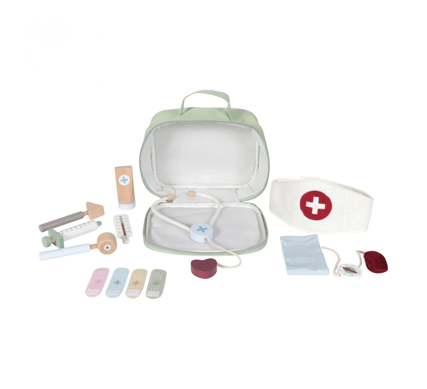 Met deze dokterstas kan jouw arts in de dop zich uitstekend vermaken. De tas zit vol met allerlei doktersspulletjes zodat je kleintje goed kan oefenen. Zo zitten er bijvoorbeeld een bloeddrukmeter, een stethoscoop, pleisters, een hamertje en een spuit in. Deze dokterstas is ook goed te combineren met de Sophia Knuffelpop van Little Dutch.