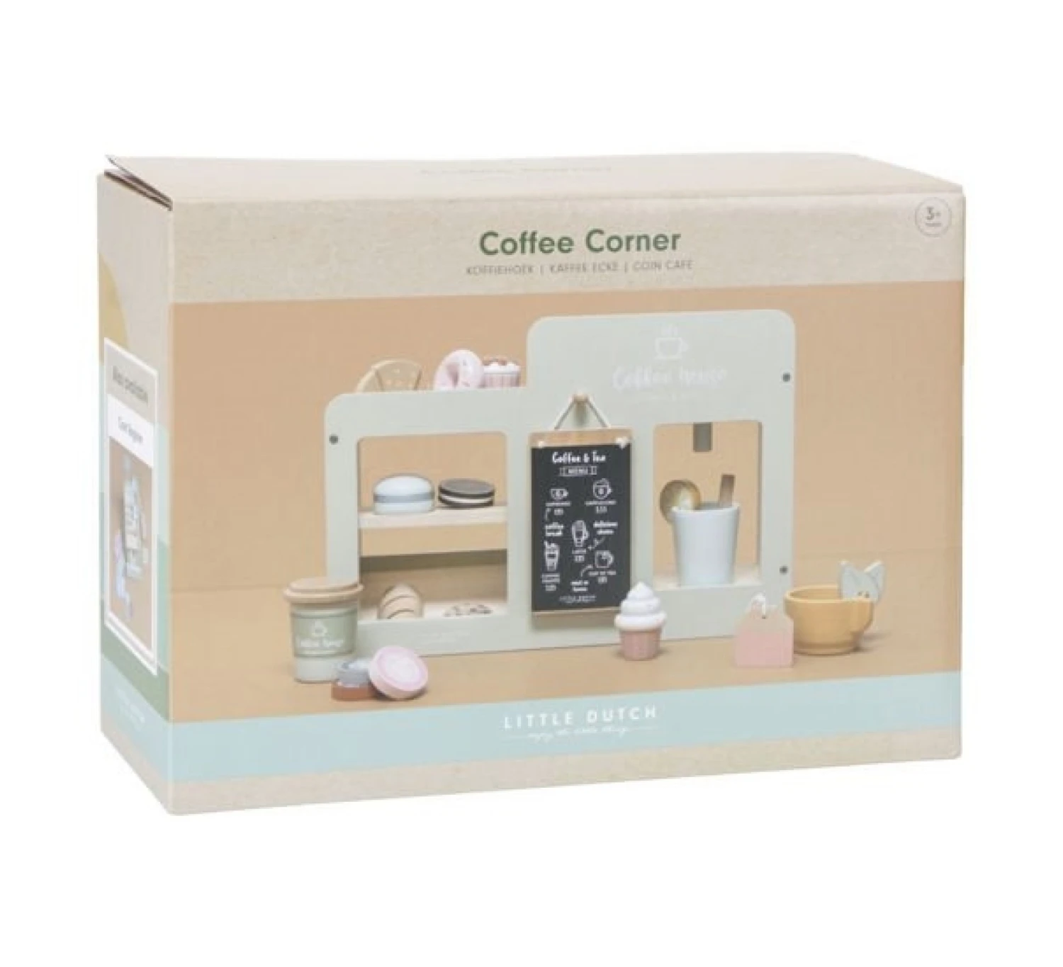 Peuters houden ervan om te doen alsof en volwassenen na te bootsen. Deze houten set inspireert de creativiteit van je kleintje en helpt bij het ontwikkelen van sociale vaardigheden en rollenspel. De koffiecorner heeft een koffie- en theeapparaat, opbergruimte voor alle kopjes en benodigdheden en een kast om alle lekkernijen uit te stallen. De vele accessoires zoals een croissant, een donut, theezakje en koffiepads, zorgen voor urenlang speelplezier.