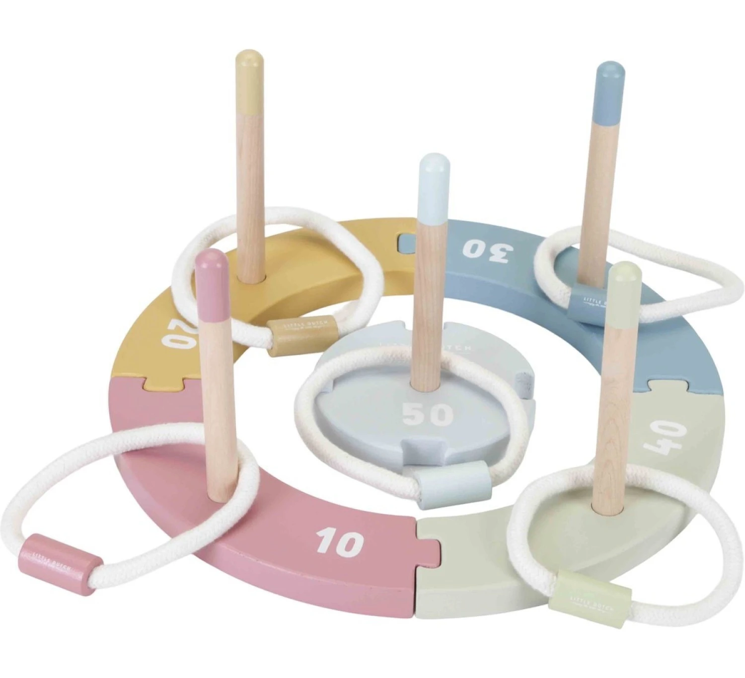 Door dit klassieke ringgooispel te spelen, ontwikkel je de hand-oogcoördinatie, het inschatten van afstanden en nauwkeurig richten van je kleintje. De set wordt geleverd met 5 houten doelframes in verschillende kleuren en met verschillende punten. Elk heeft een stokje om één van de 5 katoenen touwringen naar te gooien. Laat de set niet buiten of in de regen liggen als je klaar bent met spelen, maar bewaar het op een droge plek.