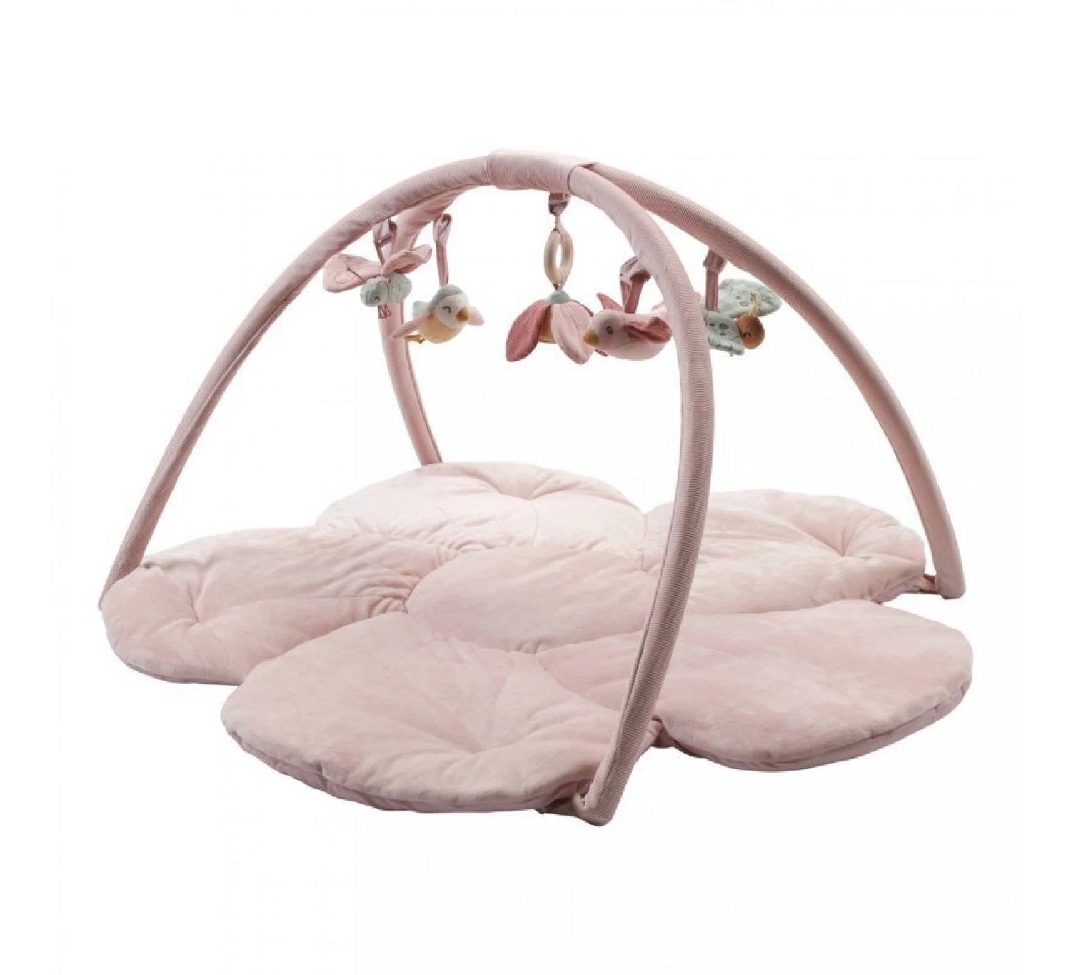 Het roze kleed heeft twee grote bogen waar 5 verschillende knuffeltjes aan hangen. De speeltjes zijn afneembaar en kunnen ook los gebruikt worden.