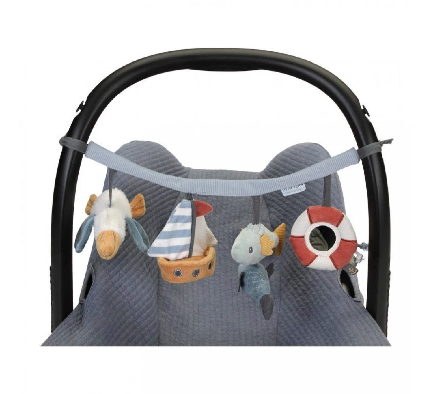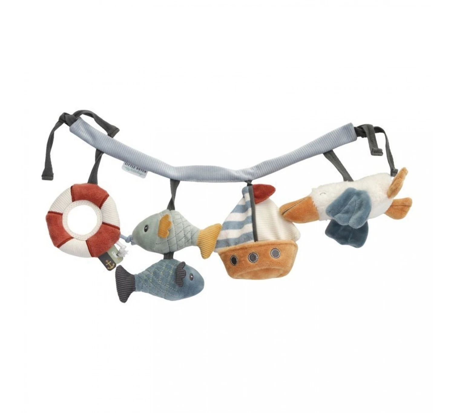 Het wordt standaard geleverd met vier hangende speeltjes om naar te kijken en vast te pakken. Er is een pelikaan, een zeilboot, een kleurrijk vissen-duo en een spiegeltje in de vorm van een reddingsboei.