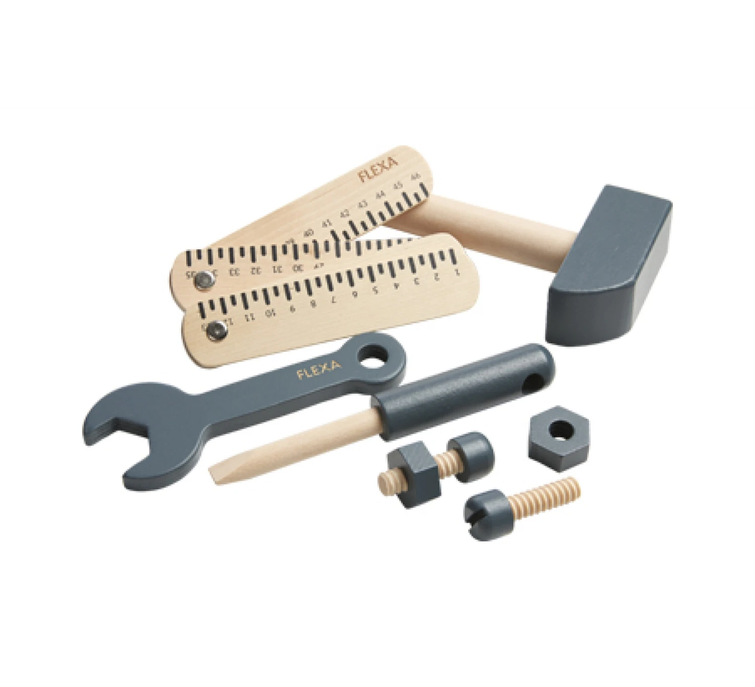 De klussenier in de dop is helemaal in zijn of haar nopjes met deze gereedschapsset. Deze achtdelige set is onderdeel van de Flexa Toys collectie en bestaat uit een hamer, een moersleutel, een schroevendraaier, twee boutjes, twee schroeven en een duimstok. Alle onderdelen uit deze set zijn gemaakt van berkenhout.