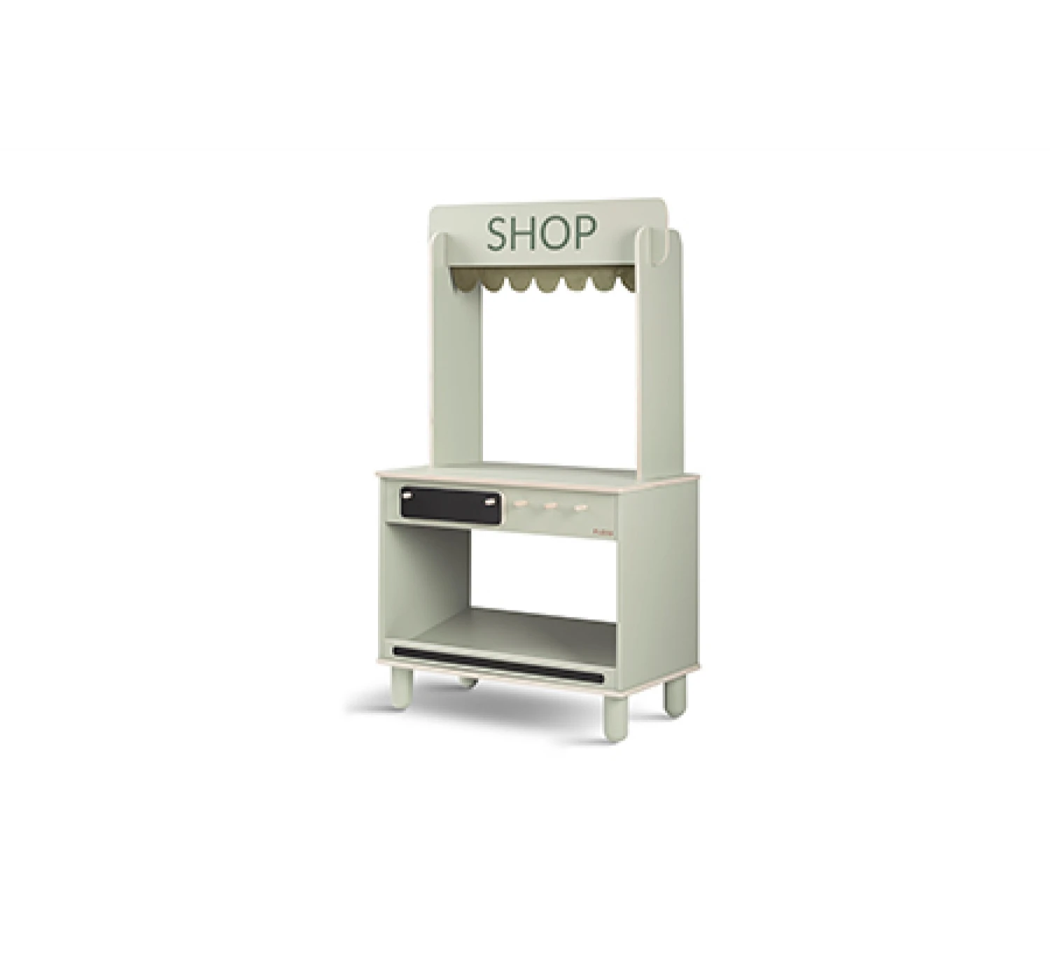 De winkel is gemaakt van massief berkenhout, multiplex en MDF. Door de trendy kleur en het speelse design past deze winkel in elke inrichting. Maak de set compleet met de kassa, het fruit, de groenten, de boodschappen en het winkel outfit om je kindje nog meer plezier aan de winkel te laten beleven.