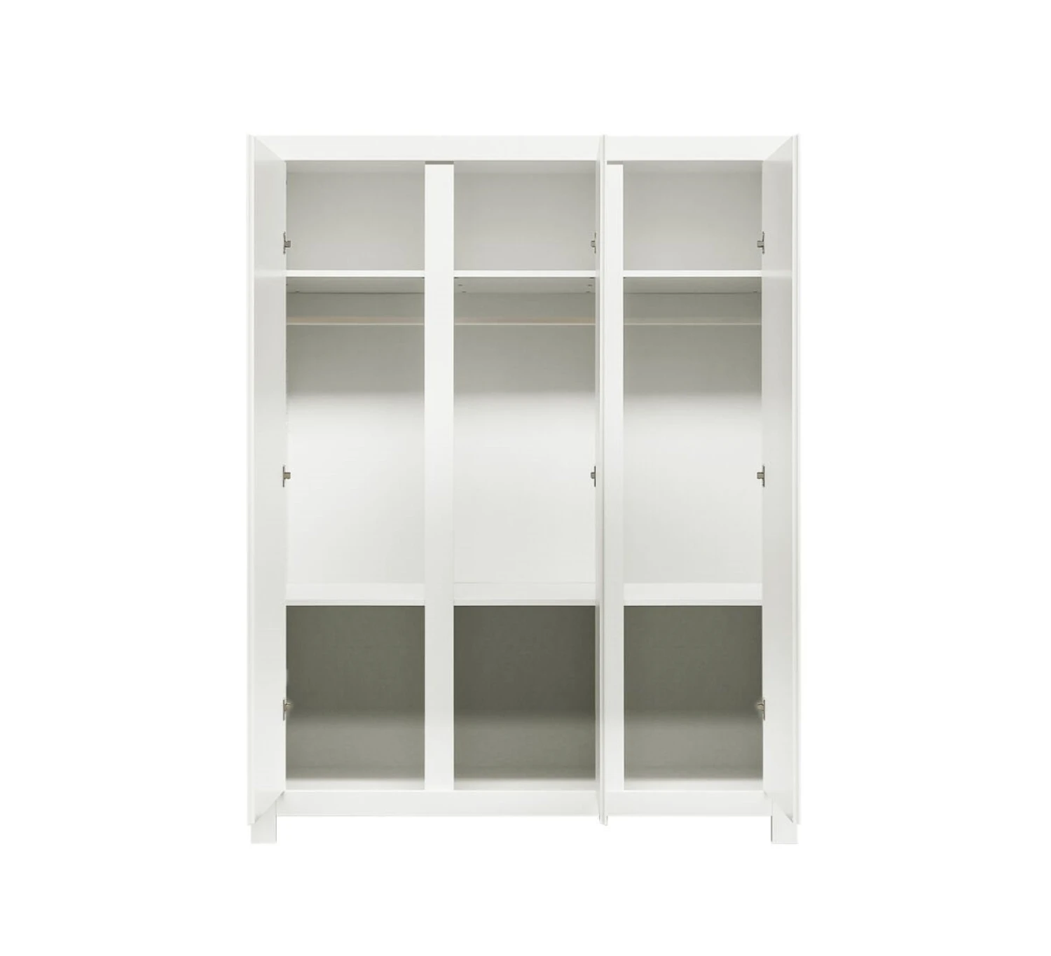 Moderne 3-deurskast van de serie Thijn. De deuren zijn greeploos uitgevoerd en zijn voorzien van subtiele horizontale groeven. Het interieur bestaat uit drie vaste schappen, drie hangroedes en 3 in hoogte verstelbare legplanken.